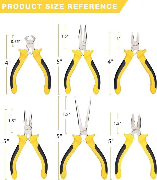 PIECE PLIERS SET: This precision pliers set includes 4-inch mini diagonal, 5-inch mini long nose, 4-inch mini end cutting, 6-Inch mini needle nose, 5-inch mini linesman and 5-inch mini bent nose. Great for fixing meticulous chores, doing precision works, repairing electronics projects.