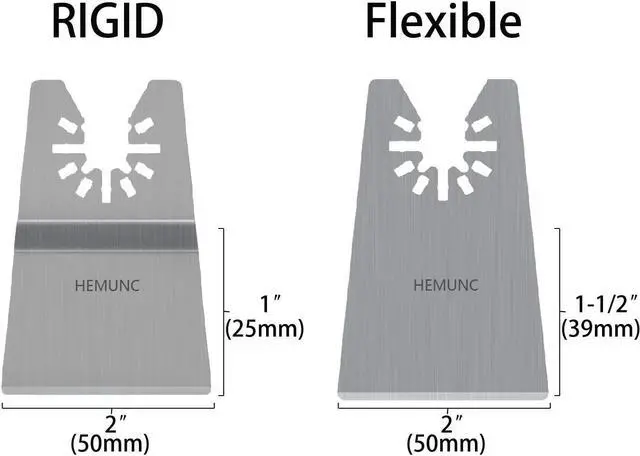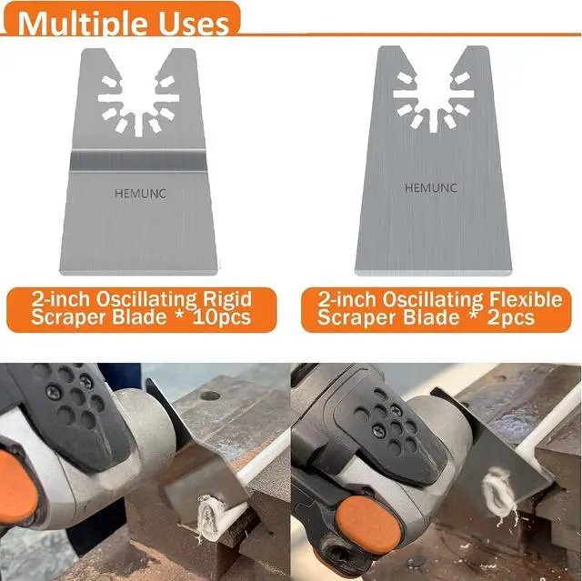 There are 2 types and 12pcs oscillating multitool scraper blades, 2 pcs oscillating flexible scraper blades and 10 pcs oscillating rigid scraper blades. Stainless Steel construction for smooth scraping and reliability.