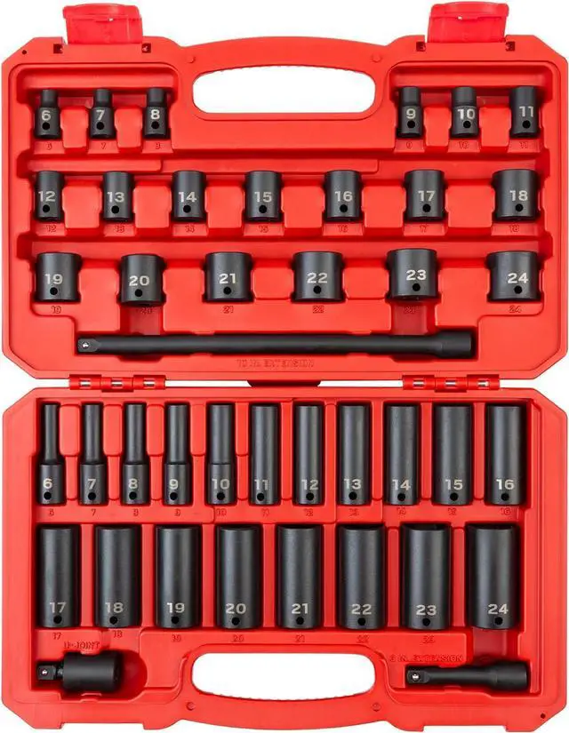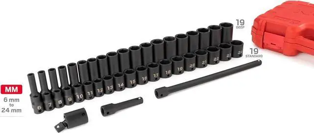 Includes 19-pc. 3/8 inch drive 6-point impact sockets: 6, 7, 8, 9, 10, 11, 12, 13, 14, 15, 16, 17, 18, 19, 20, 21, 22, 23, 24 mm.; 19-pc. 3/8 inch drive deep 6-point impact sockets: 6, 7, 8, 9, 10, 11, 12, 13, 14, 15, 16, 17, 18, 19, 20, 21, 22, 23, 24 mm.; 1-pc. universal joint: 3/8 in. drive; 2-pc. 3/8 in. drive extensions: 3, 10 in.; Storage case