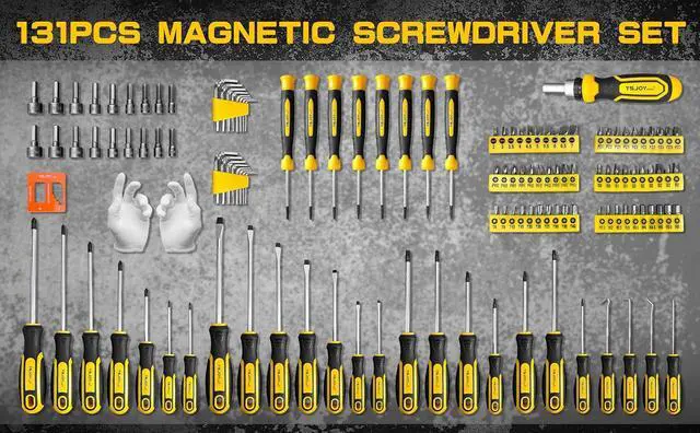 131-piece magnetic screwdriver set: comprehensive & versatile. Features 21 magnetic tips for screw grip, 4 picks/hooks for oil seals & cleaning, 8 telecom screwdrivers, 60 bits for diverse tightening, 16 hex (8 metric, 8 SAE), 18 sockets (9 each).