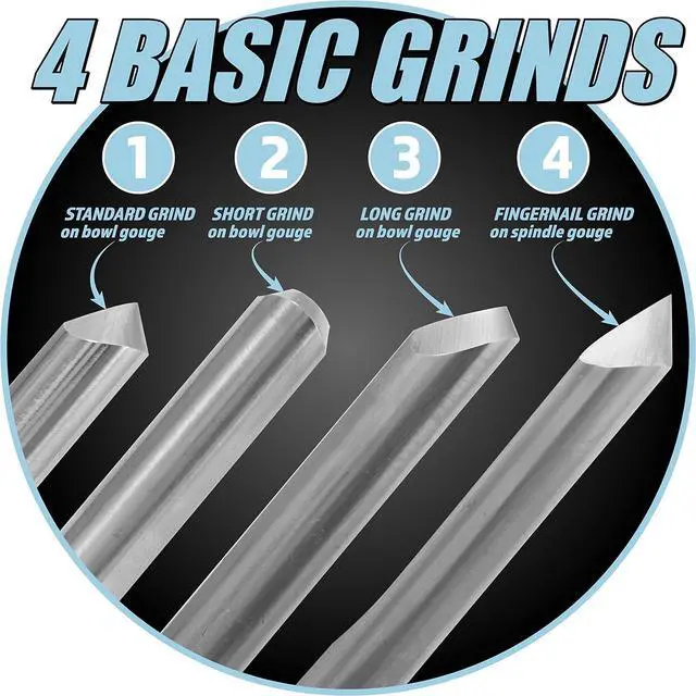 Typically there are 4 basic grind types (3 types of bowl gouges and 1 type for spindle gouges). The 4 basic grind types are standard, short and long for bowl gouges and fingernail grind for spindle gouges. These grinds are all simple to achieve using the Multi-Grind Jig and we show you how to do them in the included instructions
