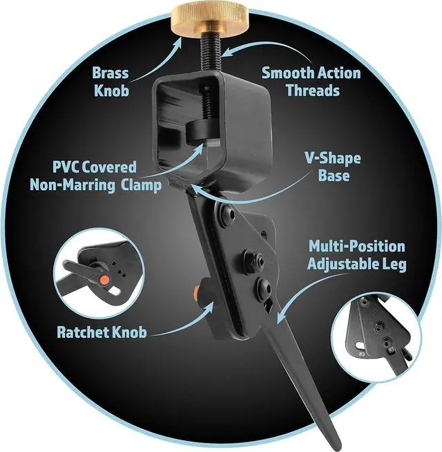 The Multi-Grind is made from high quality steel. The knob is made from brass and the threads provide a smooth rotating action when the brass knob is turned. The clamp pad is covered with a non-marring PVC material to help protect your tool while grinding. The clamp opening has a v-shape base that accepts your turning tool perfectly and wont allow your tool to accidentally roll or shift while grinding.