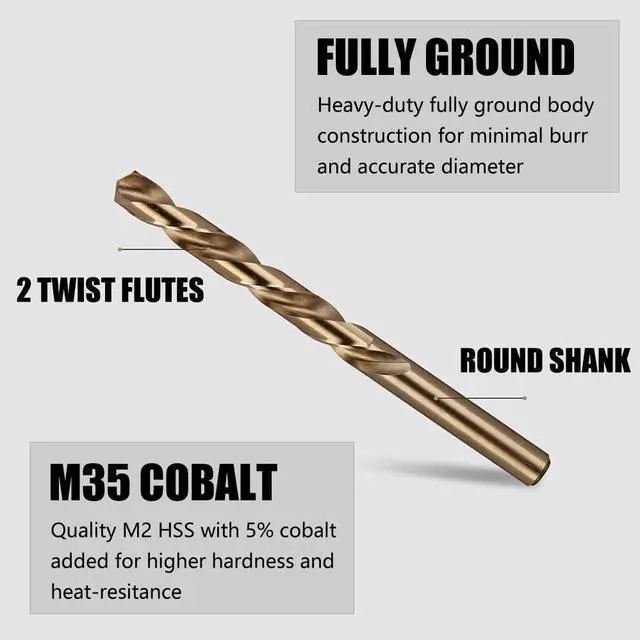 COBALT STEEL - Manufactured from M35 cobalt steel, with molybdenum and cobalt added to create a hardened heat-resistant alloy, measuring Rockwell hardness up to 67, for much faster cutting and extra longer life span, with up to twelve times compared with an average HSS drill bit.