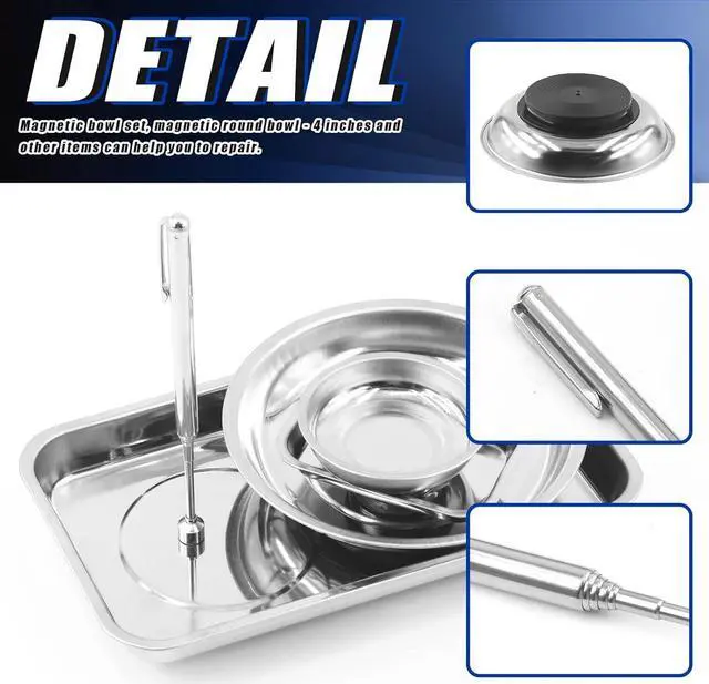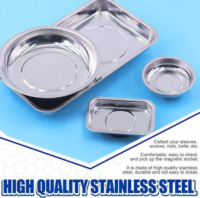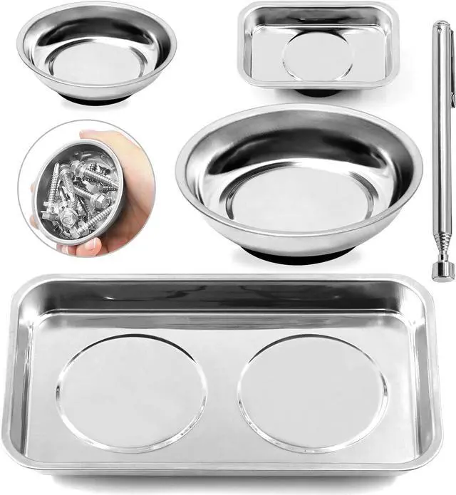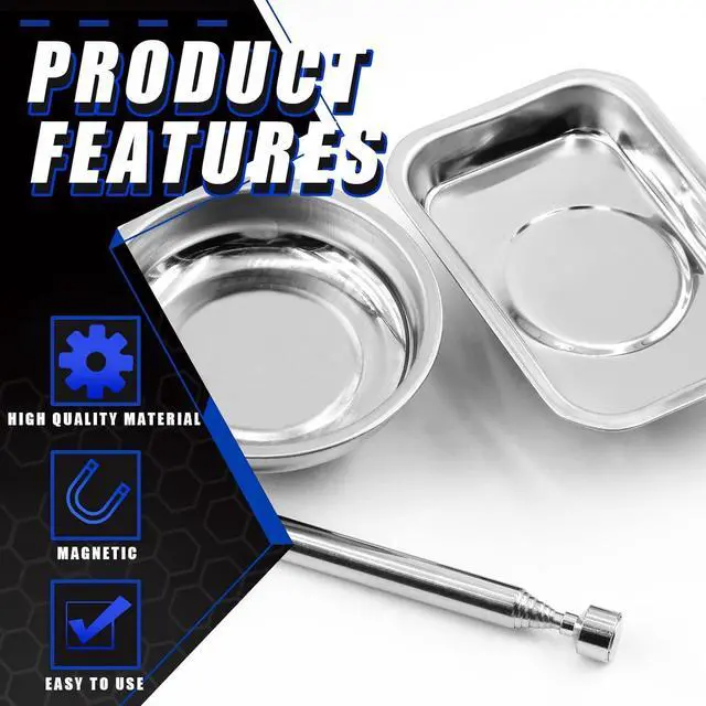 Package Included: In this package, You will receive 2pcs 3" and 6" round magnetic tray, 2pcs 3.8 x 2.6" and 9.5 x 5.5" square magnetic tray with 1pc 3lb magnetic pickup stick. This magnetic tool kit will meet you needs in finding metal items.
