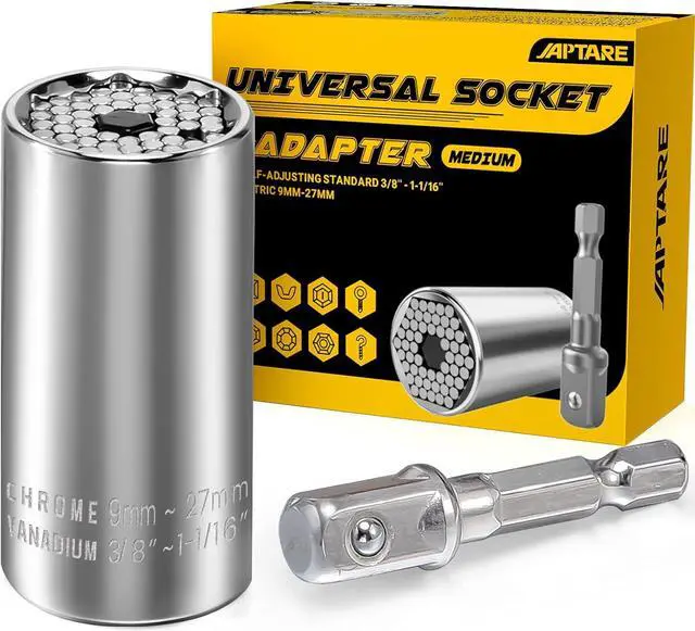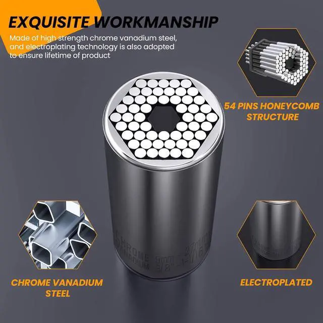 Self-adjusting Design Our universal socket comes with 54 self-adjusting metal pins design, it can be adjusted automatically to fit standard 3/8'' - 1-1/16'' metric 9mm-27mm wing nuts, hooks, cap, eye bolts, square nuts, hexes and most irregular shape. Adjustable socket wrench can meet all your needs and save a lot of time, great addition to your toolbox.