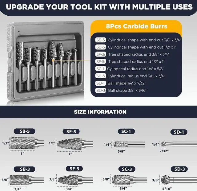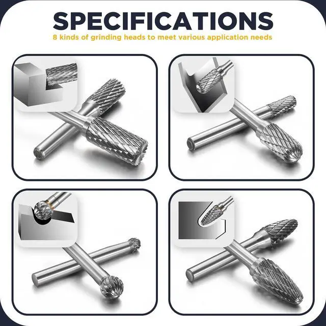 PREMIUM MATERIAL: 8pcs carbide rotary burr set, made of heat-treated tungsten carbide steel, good toughness and resistance, sharp and sturdy. Unique tooth angle prevents chipping for the longest lasting design possible