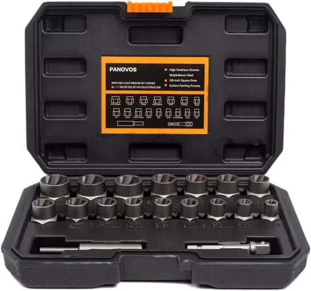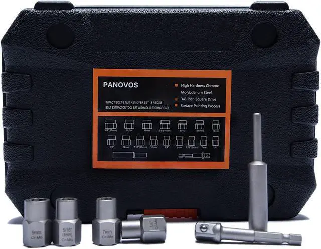 18 pieces 3/8 inch drive bolt & nut remover comes with 3/4" (19mm), 11/16", 17mm, 5/8" (16mm), 9/16", 14mm, 13mm, 1/2", 12mm, 7/16" (11mm), 10mm, 3/8", 9mm, 5/16" (8mm), 7mm, 1/4", hex adapter and knockout pin.