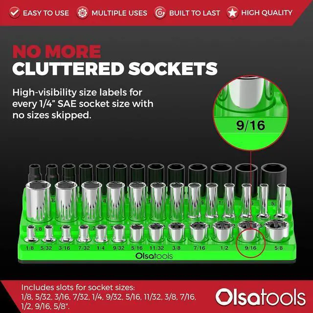 MAKE YOUR JOB LESS FRUSTRATING IN MINUTES - Our magnetic socket holder saves the frustration of sorting through the chaos of loose sockets! The organizer can store up to 39 of your 1/4-inch drive SAE sockets. Easy-to-read size markings make finding the right socket size a breeze!