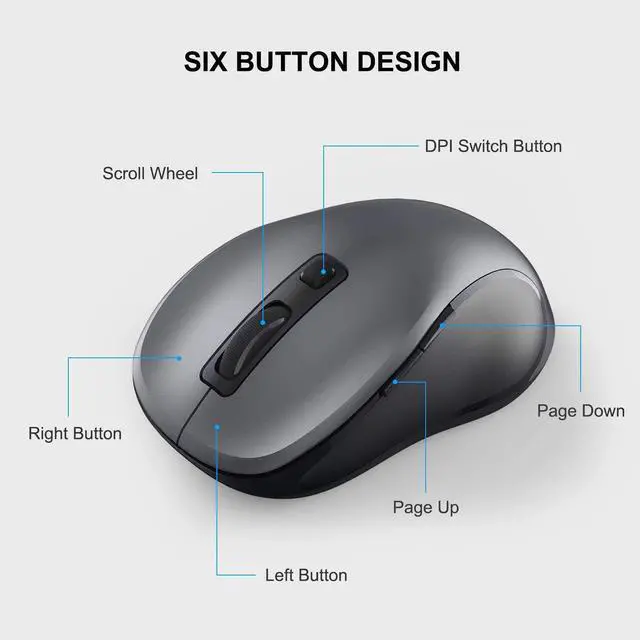 [3 DPI LEVELS & 6 BUTTONS] 3 Adjustable DPI Settings, 800, 1200 and 1600. This computer mouse gives precision tracking on just about any surface, with a DPI button helping to change the sensitivity on the fly. Extra 2 Side Buttons ideal for both work and gaming. Plug and play directly with A RECEIVER STORED IN THE BATTERY COMPARTMENT, no any driver needed!