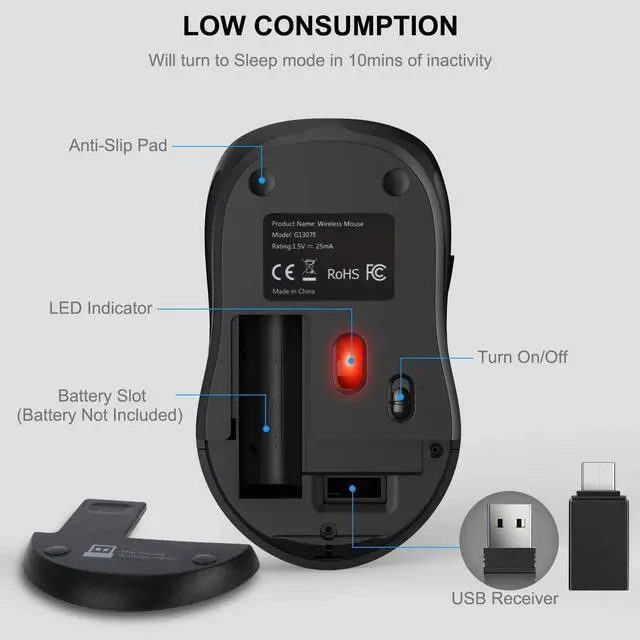 [AUTO SLEEP MODE & SYMMETRIC DESIGN] Being impressively easy to use, this wireless mouse for chromebook also keeps energy efficiency in mind. It will enter auto power-saving mode after 1 minute of idling, or sleep mode after 8 minutes of idling. Double click to wake the ergonomic mouse up. Symmetric design makes it suitable for both right- and left-hander.