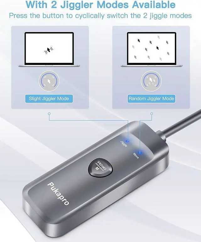 2 Jiggler Modes Freely Switch - Our mouse jiggler has 2 jiggler modes. [Jiggle mode]: Indicator light 1 is on moving the mouse pointer slightly 1-2 pixels back and forth from left to right, which doesn't affect the normal use of mice. [Move mode]: Indicator light 2 is on randomly move the mouse pointer.