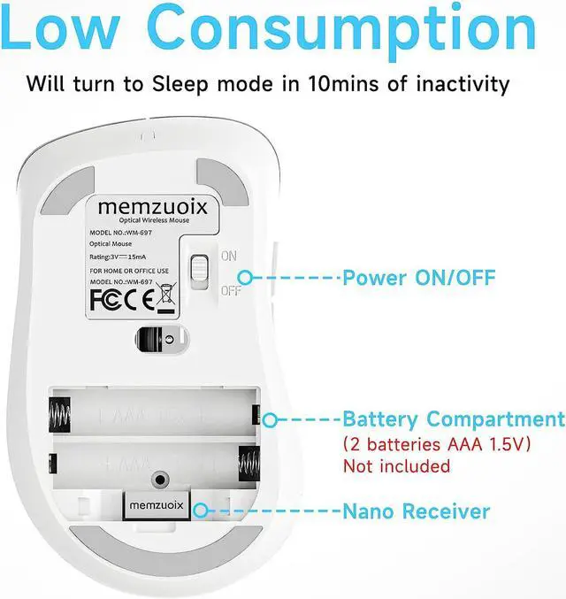 Energy Saving DesignBefore using it, please remove the USB receiver (inside the battery compartment) and then install 2*AAA Dry Batteries (Not Included)!! The 'On/Off' switch design solves the trouble of changing battery frequently. Besides, mouse for computer wireless will turn to sleep mode in 7mins of inactivity for energy saving, can be easily activated by clicking any buttons.