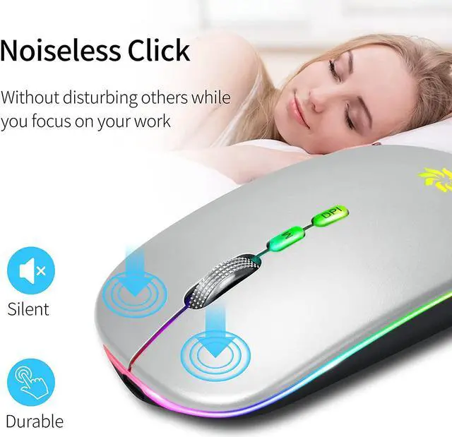 Silent Clicking & Untra Thin Design We have reduced the noise of clicking by 90% to meet most peoples needs for a silent mouse. Ultra-thin wireless computer mouse, you can carry mouse with you and put it in your computer bag without taking up much space.