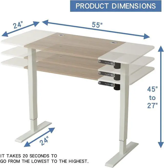 Electric Height Adjustable & Memory Settings: this smart height adjustable standing desk can be adjusted between 27"-45" according to your needs. you can press and hold a memory button until you hear a voice prompt, so that the table will remember this height, then you can quickly return to the commonly used height when you use it.