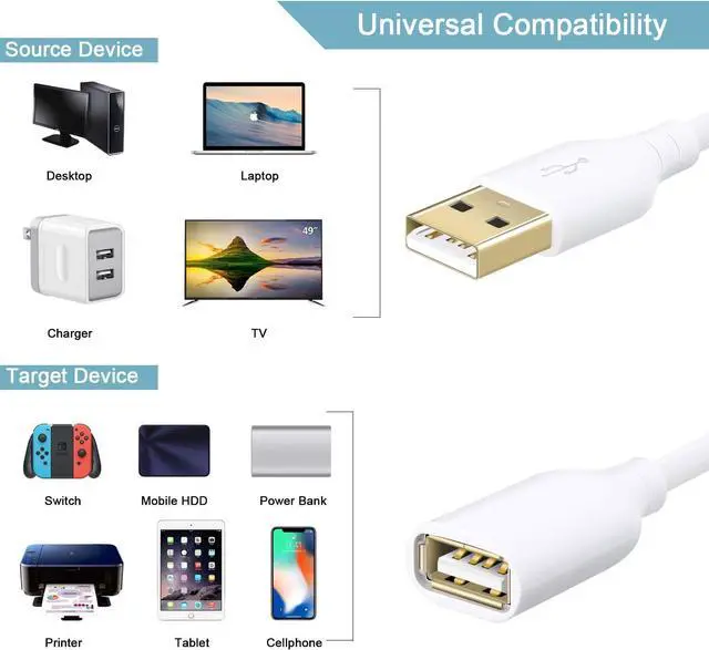 Wide CompatibilityUSB extension cable compatible with all USB-A port devices like hub, mouse, keyboard, baby monitor, camera, LED string lighter, or flash drive USB Game Controller Game Console, Play-Station/PS4, X-box, Printer, Scanner.