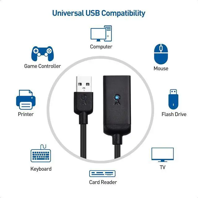 USB REPEATER CABLE extends the length of a USB 2.0 device or cable; Connect at much longer distances than a normal 6 foot USB extension cable with this USB cable extender; The USB male to female extension cable connect a USB 2.0 keyboard, mouse, printer, or scanner to a computer from across the room