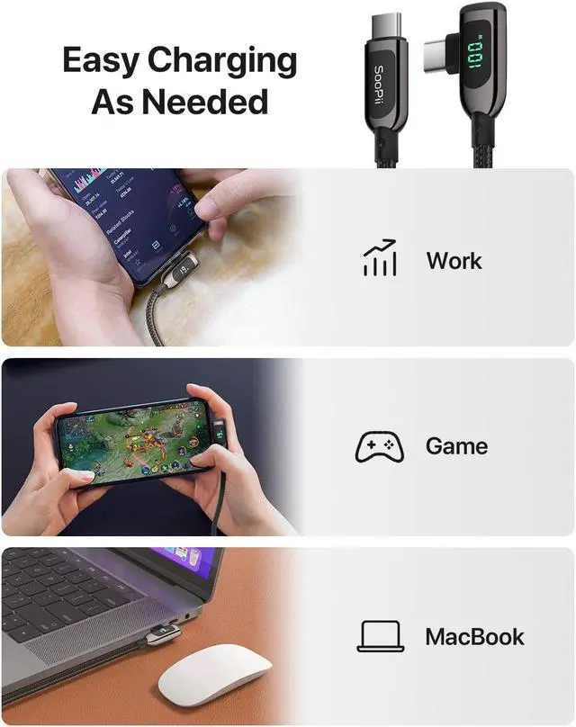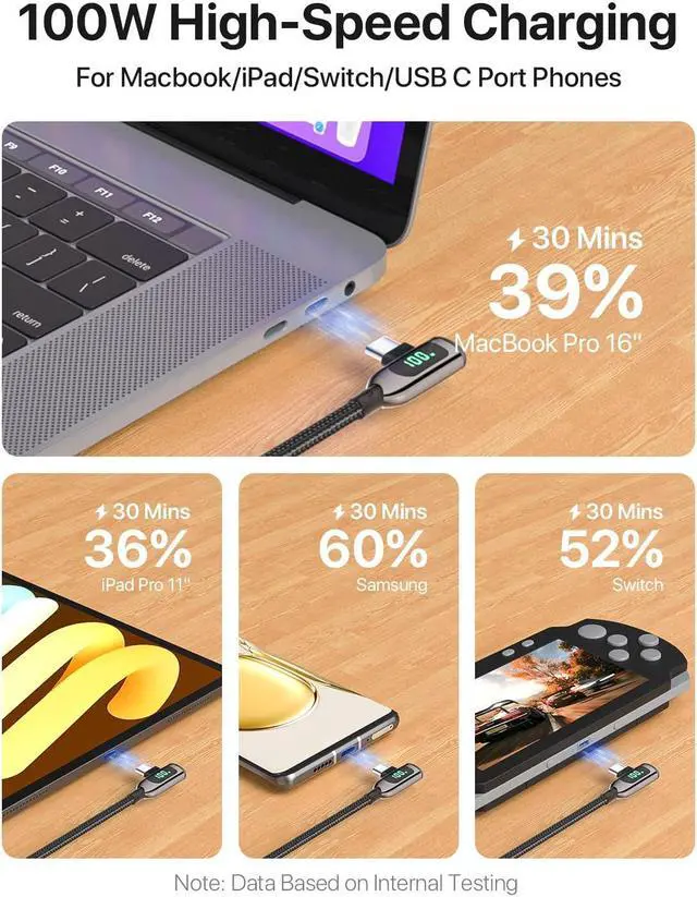 Widely CompatibilityWorks effortlessly with any USB-C device including phones, tablets, and laptops. Compatible with lphone 15, MacBook Pro 13'', MacBook Pro 15'', MacBook Air 2018, iPad Air 2020 10.9 (4th generation), iPad Pro 12.9 ''/11'', for Samsung Galaxy S21/ S21 Ultra/ S20/ S20+/ S20 Ultra/ Note 10/ Note 10 Plus/, Google Pixel 2/3/3a/4 XL, Switch/Switch Lite and more. (Note: Please use a 100W USB C wall charger to achieve fast charging. )