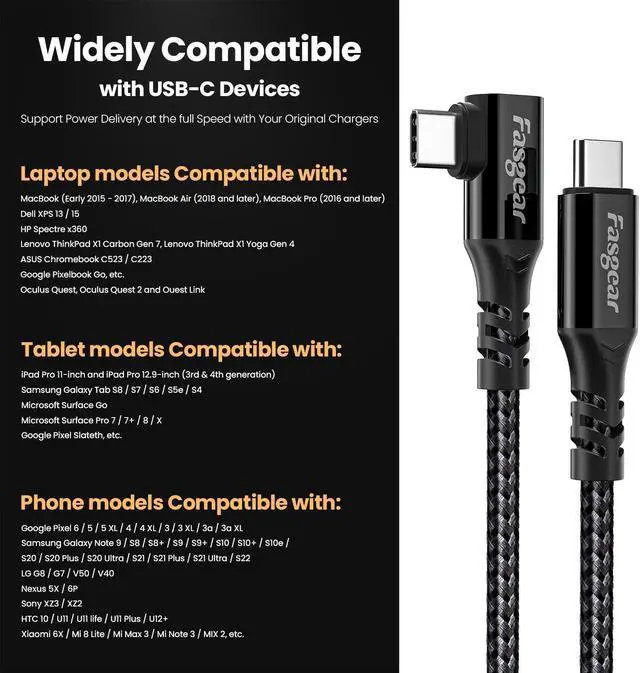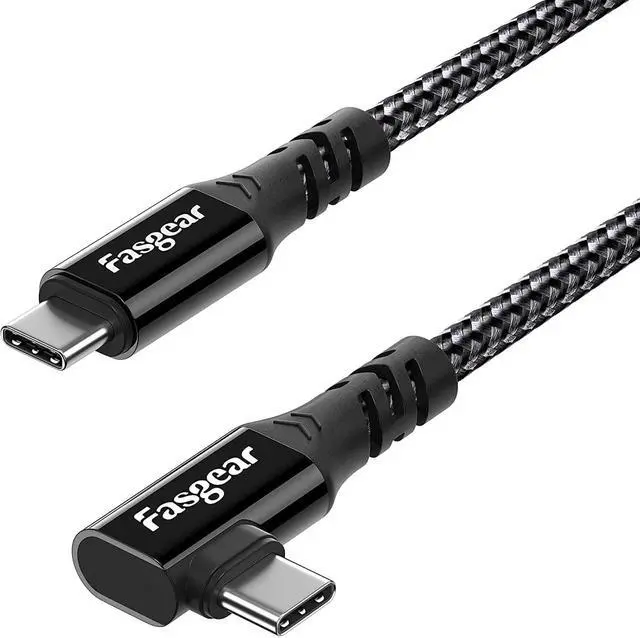 90-Degree USB-C Connector DesignFasgear USB C to USB C Cable with an creative 90 degrees L design, is good to charge in your macbook/laptop/phones. The L-Shaped right angle USB C connector plugs smoothly into your headset, while the opposite end plugs into your PC via a heavy-duty USB C connector with a reinforced base that can withstand continuous activity.