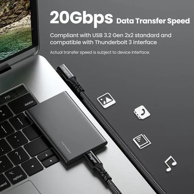 SuperSpeed+ 20 Gbps Data SyncThis high-performance 5A PD USB C to USB C cable offers a data transfer rate of USB 3.2 Gen 2x2 when connecting a portable external hard drive enclosure. Fully backward compatible with earlier