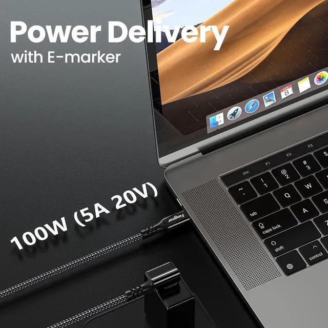 100W (20V 5A) Power DeliveryBuilted-in E-Marker IC chip, which makes this Type-C to Type-C cable strong enough to support max 5 Amps current 100 watts power through, supports up to 5A at 5V, 12V, and 20V of power output for fast charging, entirely meet the 87W charging power need of 15-inch MacBook Pro. Save more time with a quick charging rate.
