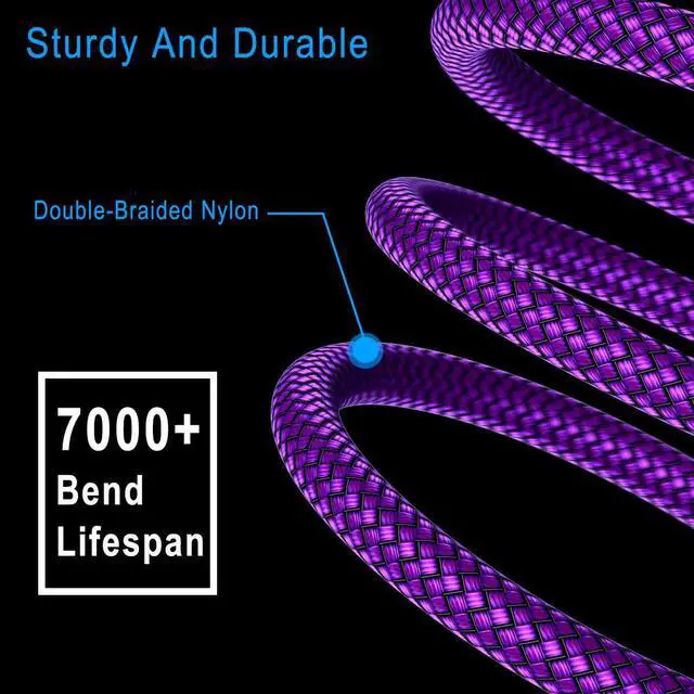 EXTREMELY DURABLE --- Our product is a durable and sturdy cable that you can rely on, with a double-braided exterior and a premium aramid fiber core. It boasts a 7000+ bend-tested lifespan, which enables to endure daily wear and tear. The aluminum alloy connectors also have reinforced necks to reduce damage from bending.