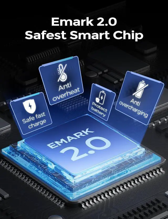 EMARK SAFE FAST CHARGING CHIPThe all-new EMARK 2.0 chip can maximize device safety while also allowing for quick charging. It can guarantee a lower charging temperature to guard against harm to the device and will automatically stop charging once the device is fully charged to guard against overcharging harming device's battery.