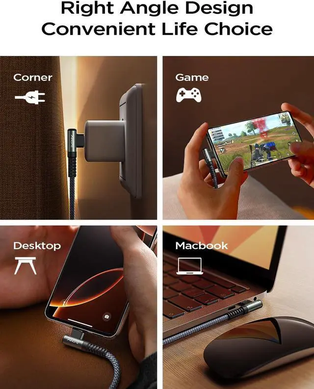 UPGRADED EXCLUSIVE RIGHT ANGLE DESIGNThis right angle type c iPad Pro and Macbook Pro charger cable and cord fast charging with an innovative 90 degrees "L" design. It's user-friendly design more convenient and comfortable for playing games, watching videos, reading e-books when you charging.