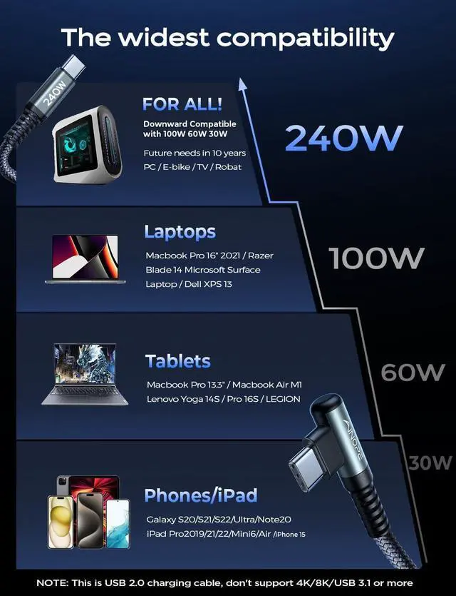 FIT for ALL C PORT DEVICESAll high-power to low-power (240/200/170/140/100/60/18W) devices(such as Samsung S20/21/22, iPad Pro/Air/Mini, Macbook Pro) are totally compatible with AINOPE 240W C to C type fast charging cable. And it's data transfer speeds up to 480Mbps (1200 songs synced per minute). It's just USB 2.0, not USB 3.0 /4K