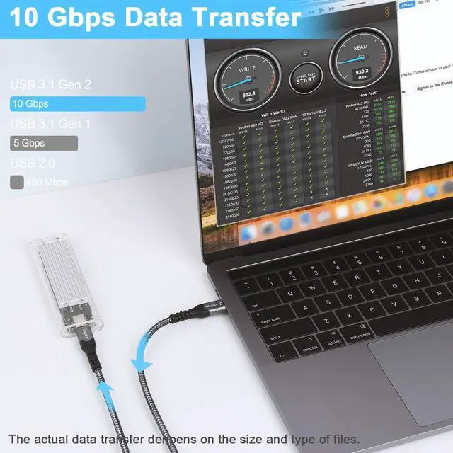 10Gbps Data TransferFasgear USB C to USB C Cable supports data transfer rates up to 10Gbps, 20x faster than USB 2.0 Type C cable, only a few seconds with an HD movie. And large files will be finished in seconds.