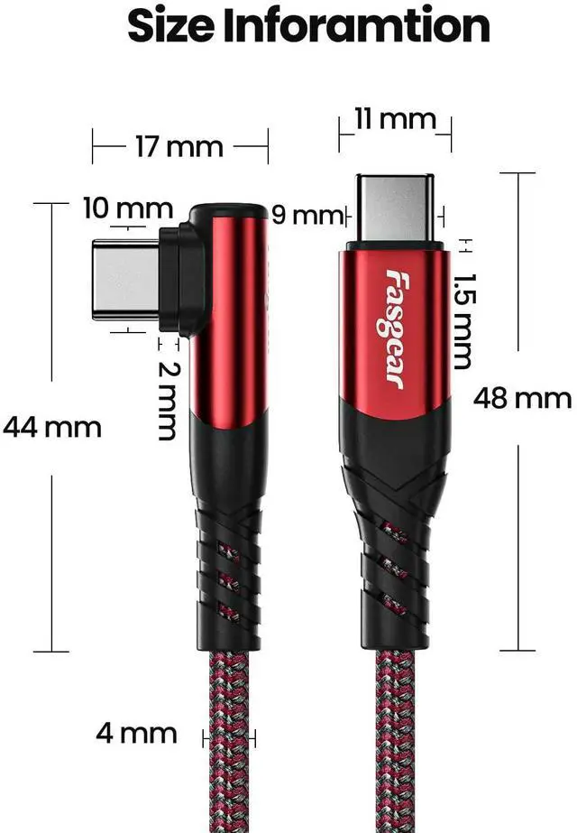 Right Angle 90-Degree L-Shape DesignFasgear Right Angled 90° USB-C to USB-C Cable is suitable for narrow places. When you play games on your phone or game console, the L-Shaped Angled plug can bring convenience and comfortableness to fast charging. With a 90-degree angled type c port, the durability of this 60W USB C charger cable can be increased by avoiding bending and splitting issues.