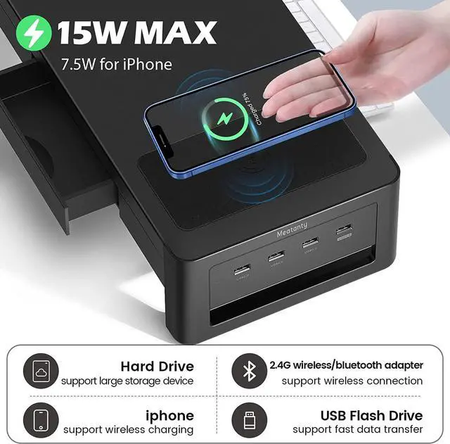 Wireless Charging ModuleWith Max 15W wireless charger, Meatanty monitor stand makes charging more convenient by simply putting your phone on the charging area.