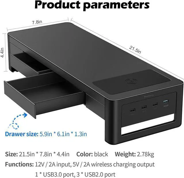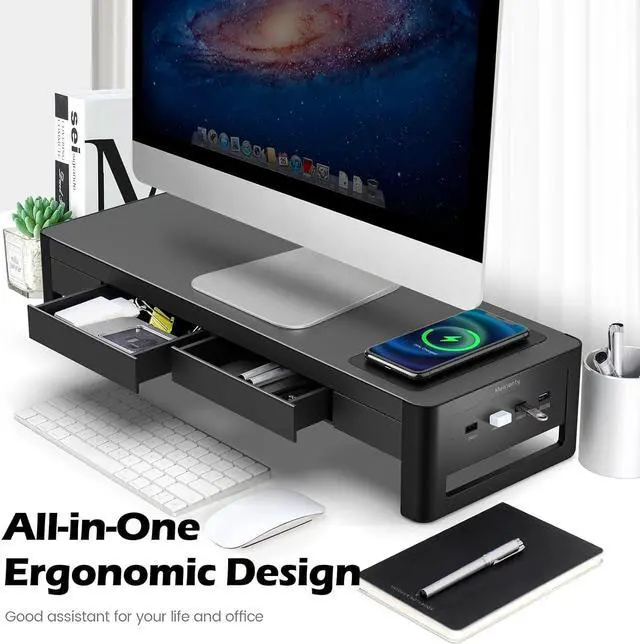 3-In-1 Multi-Functional Design The only monitor stand with drawer, wireless charging and USB extension on the current market, which greatly improves your convenience and comfort in daily life and office. Made of high quality metal material, this monitor stand riser can support items up to 66 pounds and monitors up to 27 inches.