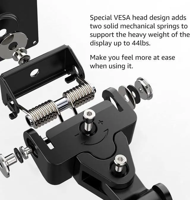 The highlight: In the VESA head, we add two powerful mechanical springs. Special vesa head design, able to support heavy weight monitor without the appearance of drooping your monitor.