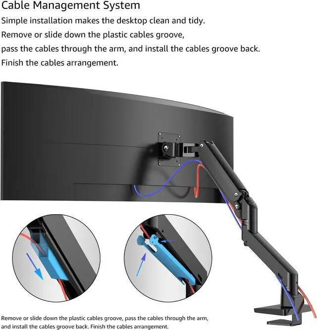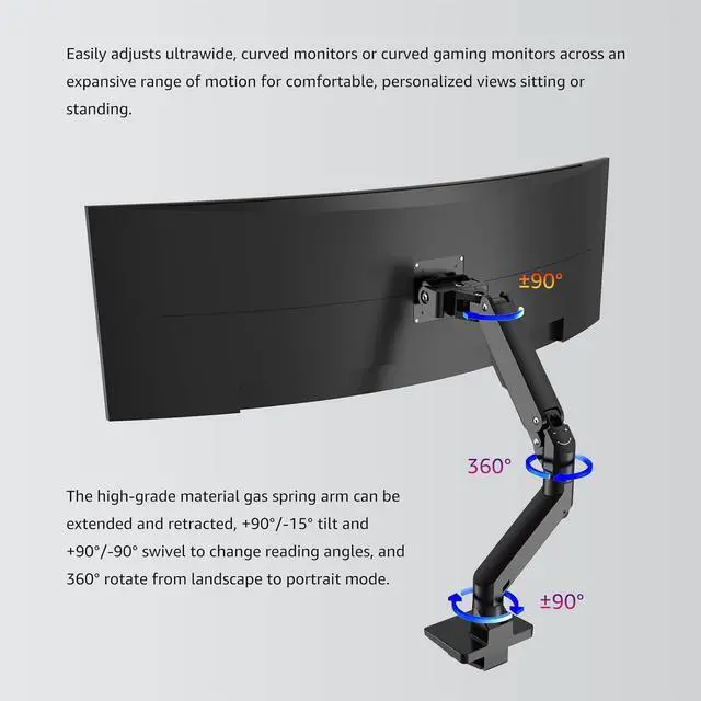 Easily adjusts ultrawide, curved monitors or curved gaming monitors across an expansive range of motion for comfortable, personalized views sitting or standing. The high-grade material gas spring arm can be extended and retracted, +90°/-15° tilt and +90°/-90° swivel to change reading angles, and 360° rotate from landscape to portrait mode.
