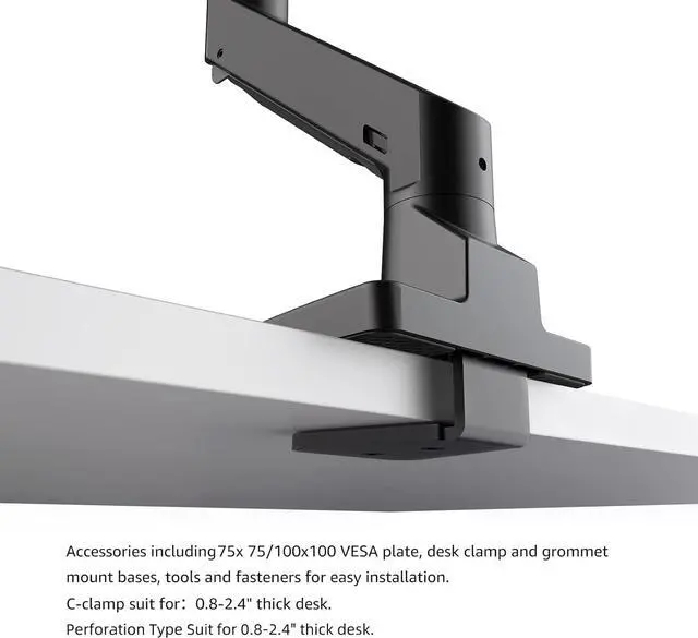 Heavy duty monitor arm securelylifts, turnsand tiltsultrawide monitors for an immersive viewing experience for work or gaming. Comes with interchangeable C-clamp or grommet base mount for use on desktops up to 2.4 inches thick.