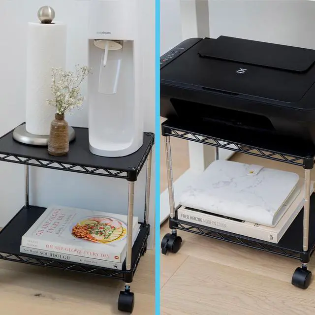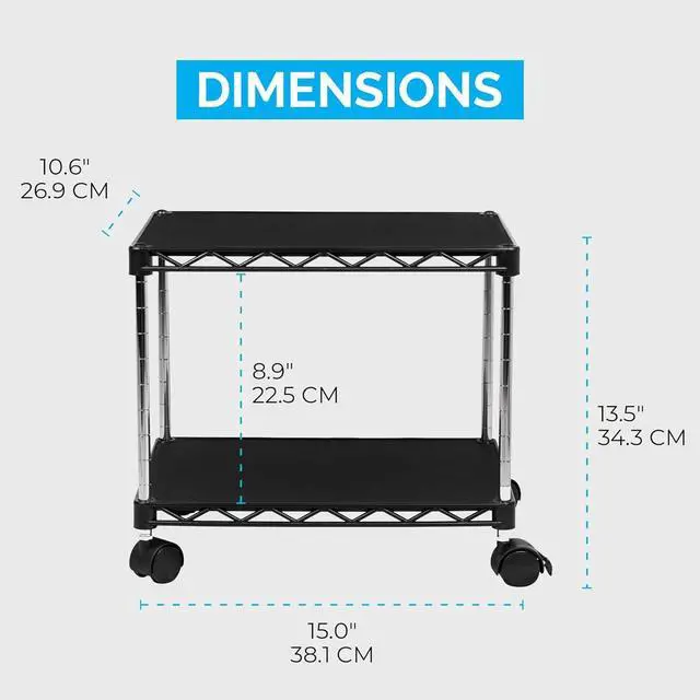 STURDY & DURABLE: The cart's steel rods provides stability while each hard sturdy ABS plastic shelf resist chipping and scratching. Each shelf can accomodate up to 40 lbs of weight. Easily store backup paper and other supplies on the bottom shelf while housing your main printer unit on top.