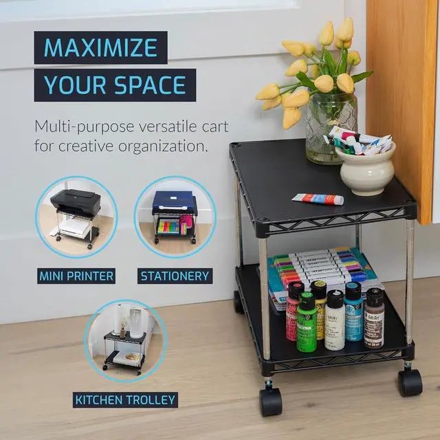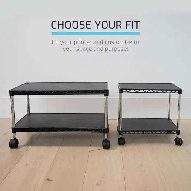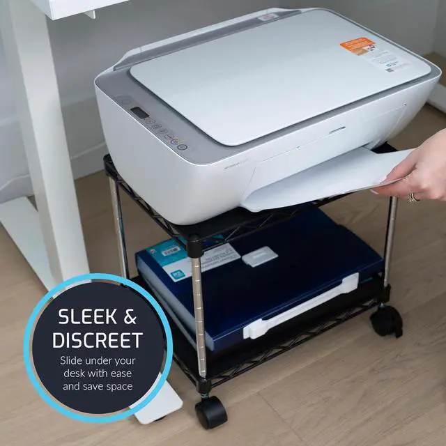 SPACE SAVING COMPACT DESIGN: The Mini Printer Cart holds small inkjet printers, scanners and fax machines within easy reach, but off your desktop. The cart is designed to fit under desks, freeing up valuable floor and table space. The bottom shelf holds paper, toner or other supplies for quick access. If you have a small home office with a small printer footprint, the Mini is just for you.