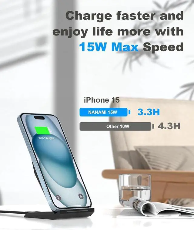 [ 1.4 Times Faster Charging Speed] Upgraded with 1.4 times rapid charging speed than standard wireless charger, built-in high-quality two copper coils offer you much wider charging area and better efficiency. NANAMI charger stand will juice up your iPhone 13 from dead to full in 3 and half hours. Perfect Gift Choice for Christmas.