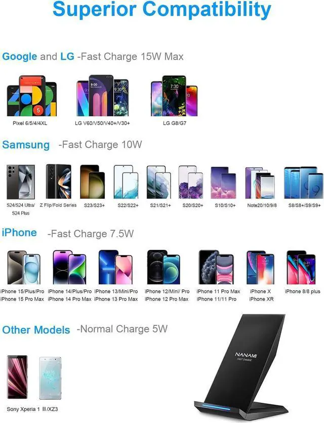 [Upgrade 4 Charging Mode] High efficieny 15W fast charging mode for LG G7/G8/V40; 10W fast charger for Samsung Galaxy S24/S23/S22/S21/S20/S10/S9/S8/Note 20/10/9; 7.5W quick charger for iPhone 16/15/14/13/12/11/XS Max/XR/8/8 Plus; 5W standard charger for other Qi-enabled devices.