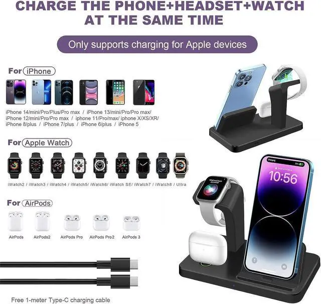Universal CompatibilityFDGAO charging stand compatible for all iPhone 14/14 Pro/14 plus/14 Pro Max, iPhone 13/13 Pro/13 plus/13 Pro Max, iPhone 12/12 Pro/12mini/12 Pro Max, iPhone 11/11 Pro/11mini/11 Pro Max, iPhone XS MAX /XS /XR /X /SE (2nd generation), iPhone 8 Plus /8, iPhone 7 Plus /7, iPhone 6s Plus/6s/6/5; Compatible with Apple Watch 8/7/6/SE/5/4/3/2 & iWatch Ultra/Nike+/Sport/Edition/Hermès; Compatible with AriPods Pro 2/Pro/3/2/1.