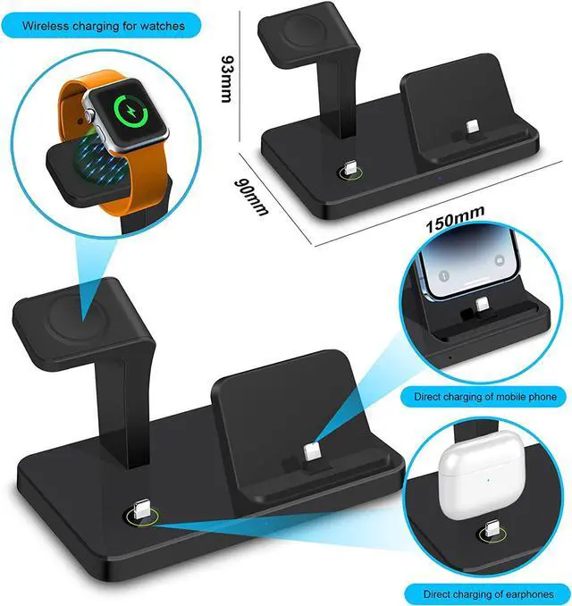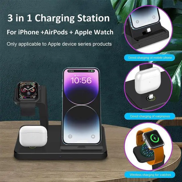 3 in 1 Charging Station for Apple DevicesAll charging cables are built-in. The charging dock has a built-in magnetic charger for the iWatch, as well as two built-in charging interfaces for the iPhone and AirPods. Only need 1 cable to charge your 3 devices imultaneously in one place. This charging station perfect to keep your desk or nightstand tidy and eliminate multiple cords. You can enjoy the convenience of your Apple devices fully charged when you waking up.