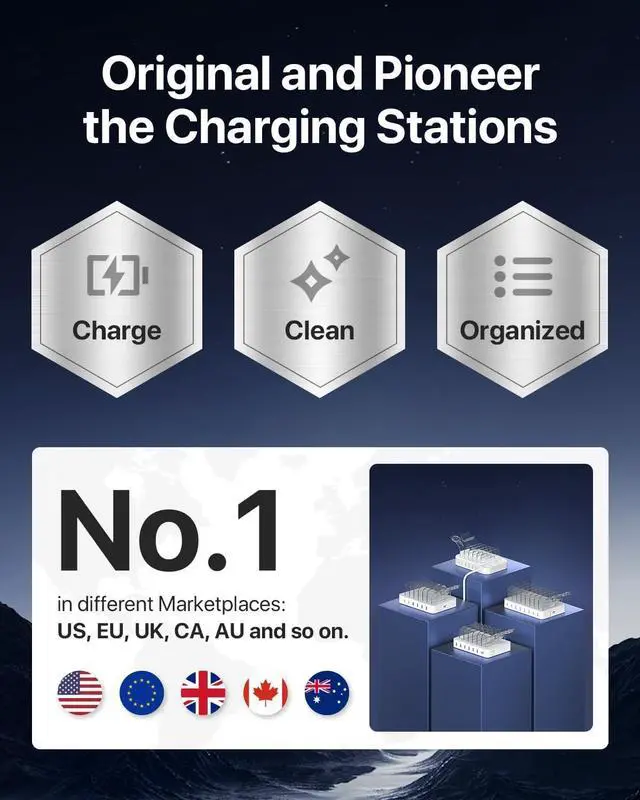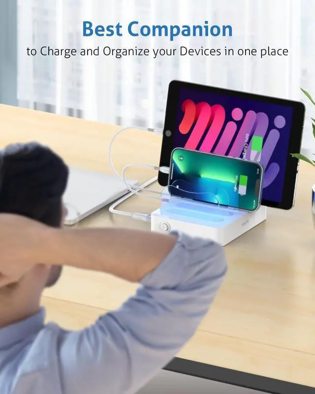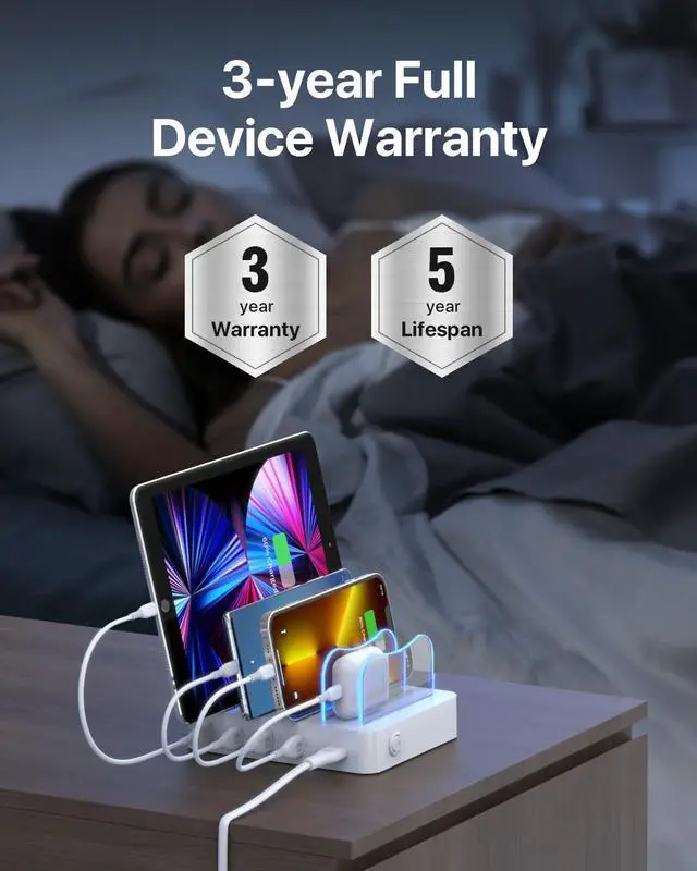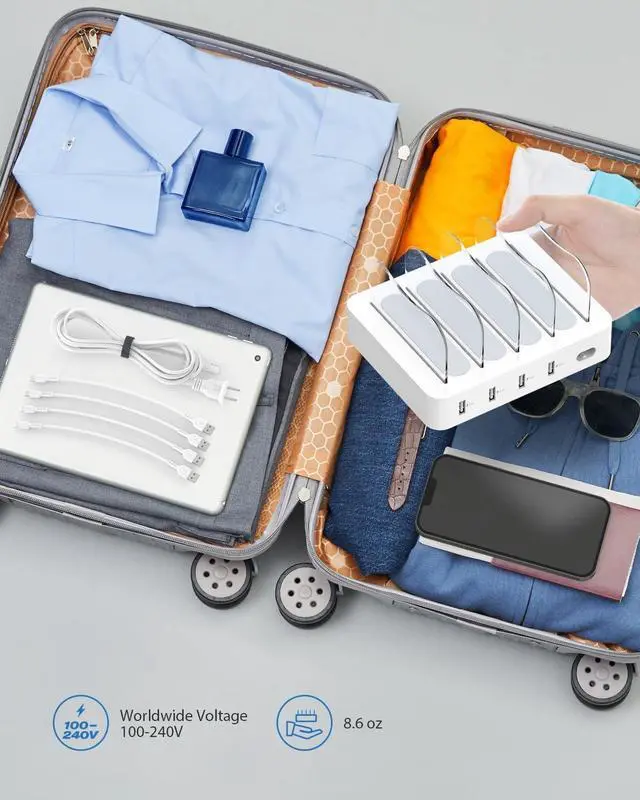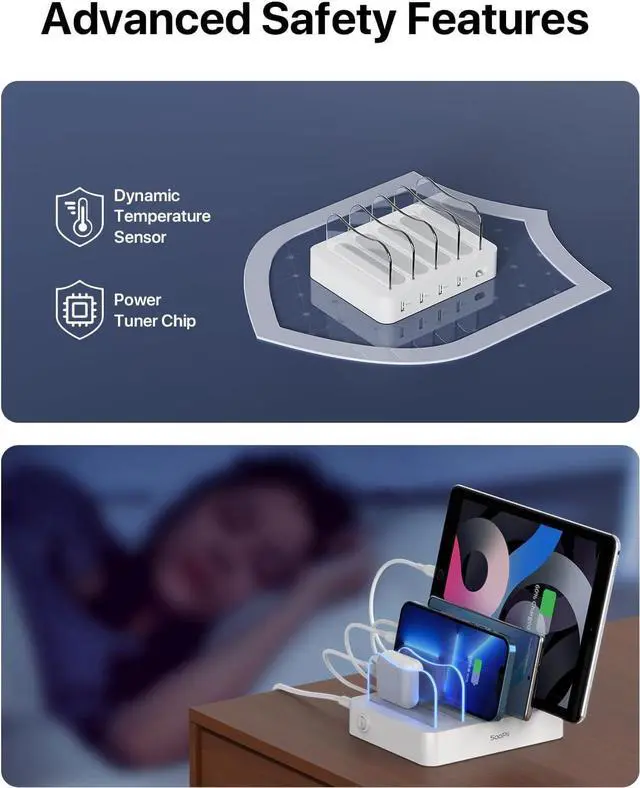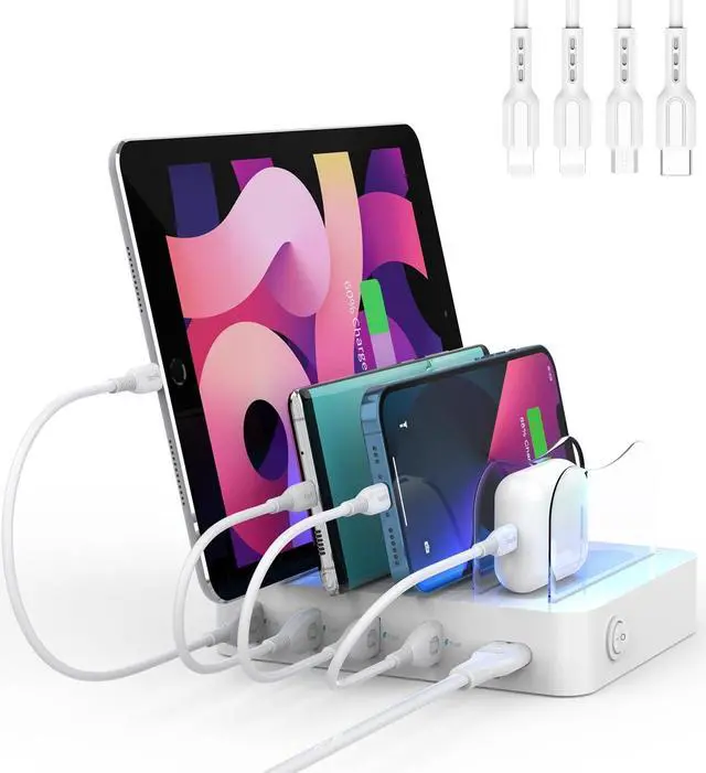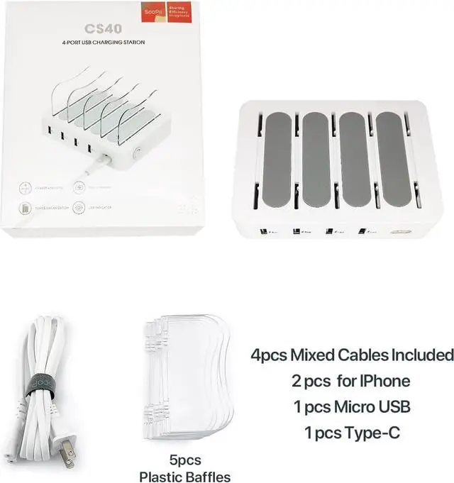 Compact Charging Station With Charging Cables IncludedWith Compact and Space Saver Design, SooPii 4 port Charging Station charge any device at its fastest possible speed(up to 2.4A ) simultaneously. Organize your phones, tablets, earphones, watches on the station, clean and neatly, save your desk space. Best Companion for home, Office and Travel use.