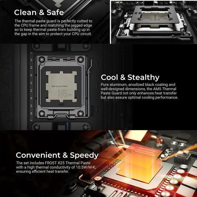 • The AM5 TPGS CPU mounting bracket features excellent thermal conductivity, ensuring efficient heat transfer from the CPU to the cooling system. Enhances your system cooling performances and keep your CPU temperature within safe ranges.