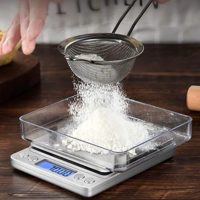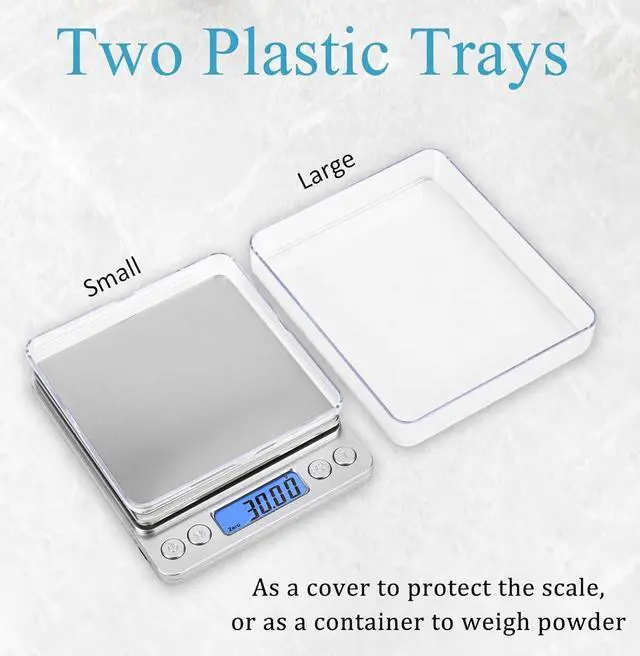 -- There are 2 transparent plastic trays covered the scale ( ), not only as containers but also as protective covers, food grade stainless steel panel and the backlit LCD display ensure more safety and accuracy.