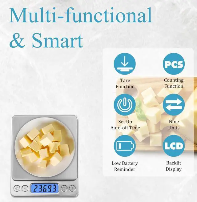 -- With 4 large buttons (Power/ M/ PCS/ T), M for units changing, PCS for counting function, T for peeling tare function, what's more, 60 second automatic shutdown function for maximum battery power saving.