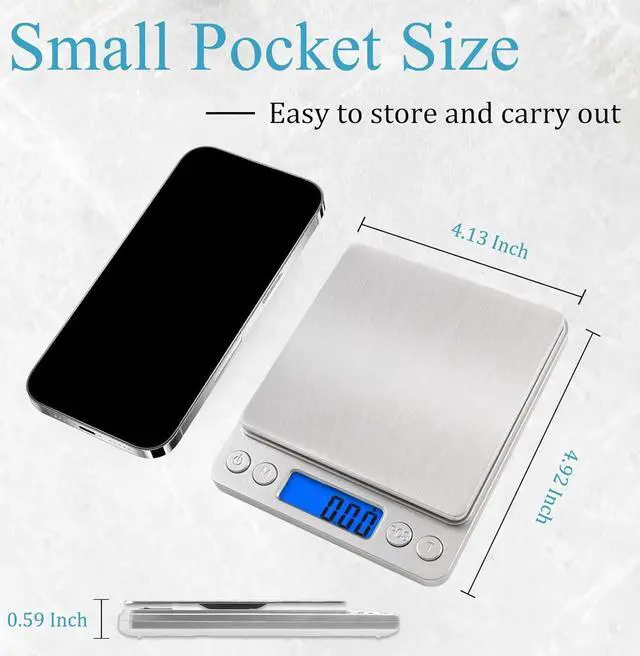 -- Portable small size design, the size of gram scale is 4.92 * 4.13 * 0.59 Inch, only like an adult's palm, easy to store and carry out. Please consider whether this size meets your requirements before choosing.