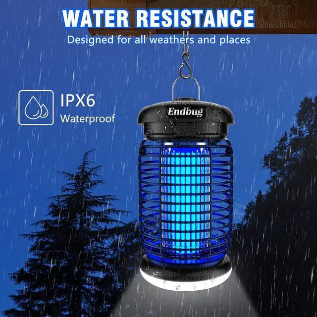 IPX6 WATERPROOFDesigned with IPX6 grade waterproof, Endbug electric bug zapper is resistant to harsh weather conditions, ensuring longevity. With a hanging hook, it can be used in various locations, including home, balcony, patio, garden, porch, courtyard, farm, office, swimming pool, garage, pergola and more.