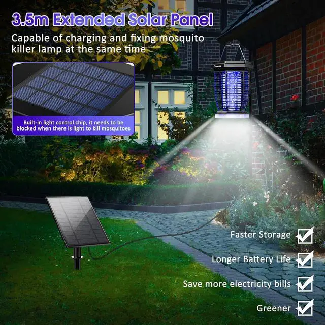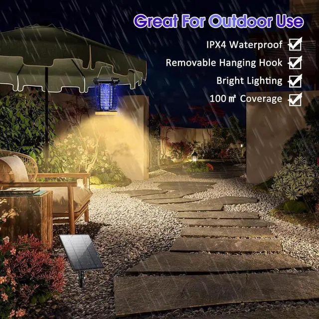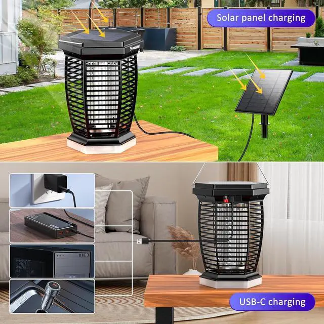 2W+4W Solar Panel and IPX4 WaterproofThe bug zapper has a 2600mAh lithium battery built in, which can be fully charged in 3-5 hours via USB-C and can operate for 13 hours under lighting. Our solar-powered bug zapper is IPX4 waterproof and works well in heavy rain. External solar panel, 3.5 meters long cable, inserted into the ground or screwed outside the wall and can be connected with the bug zapper, in the form of electrical energy storage.