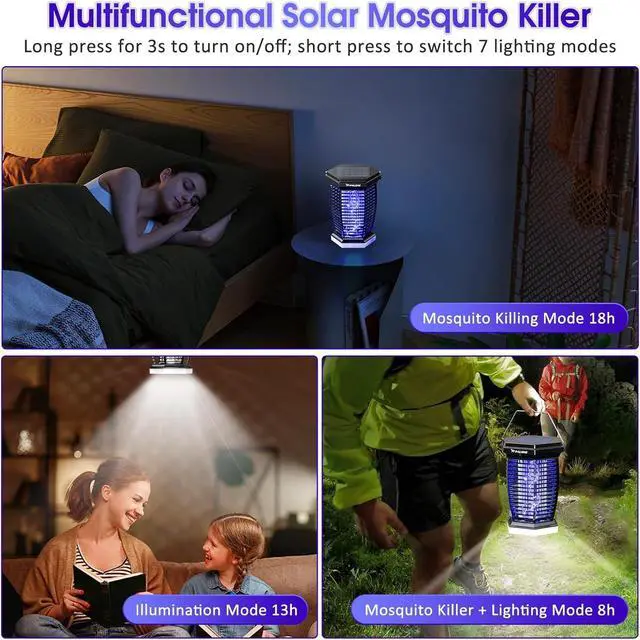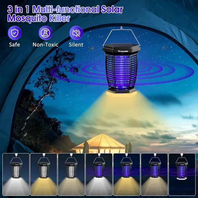 Intelligent photosensitive controlThe solar bug zapper uses the latest photosensitive intelligent chip. The PALONE Solar Camping light detects light through the 2W solar panel on the fuselage and automatically turns on/off. The solar charging time is 7-9 hours, and it can work for 18 hours in mosquito killing mode alone, which is ideal for home and outdoor use.