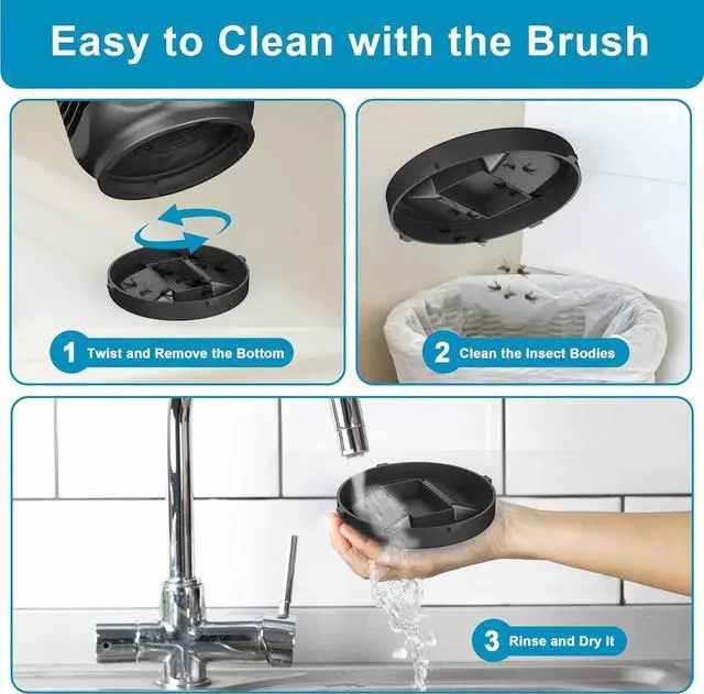 Easy to clean: dead bugs will fall onto the tray, the bottom tray is removable and a small brush is provided. Bulbs can be easily replaced